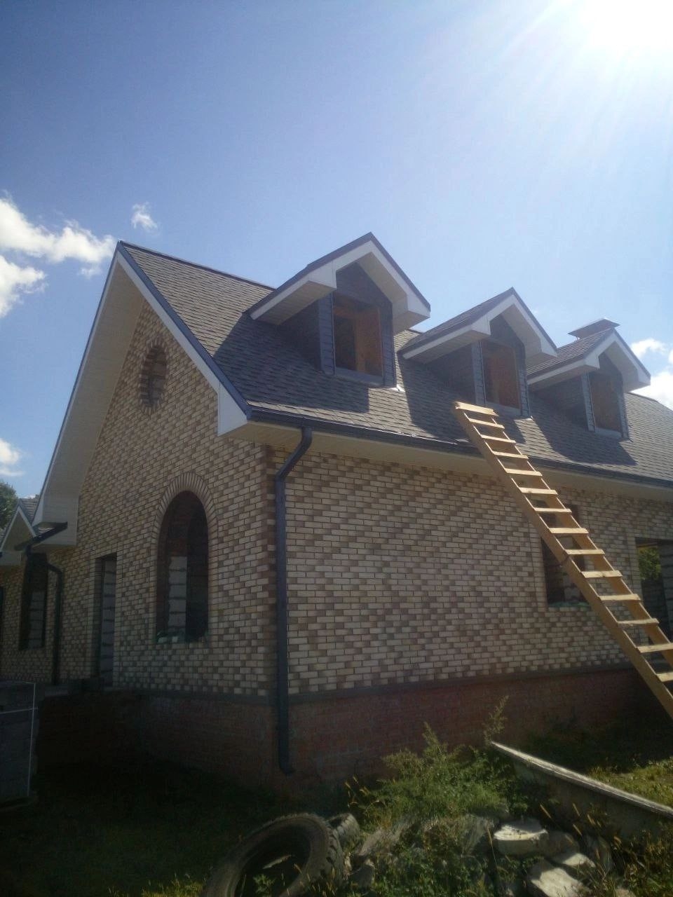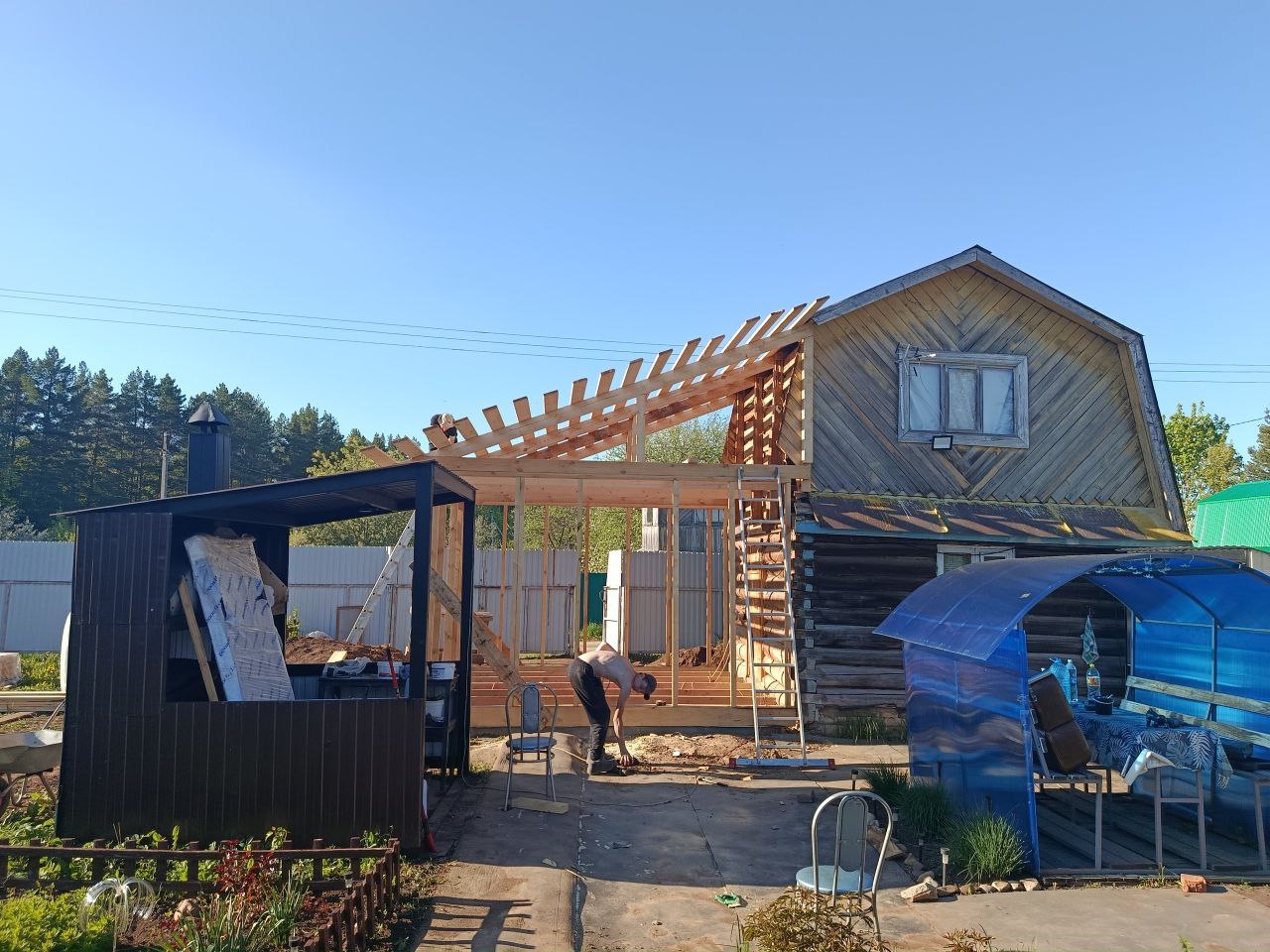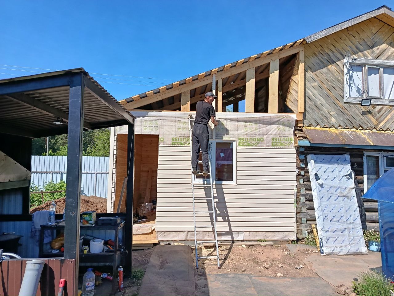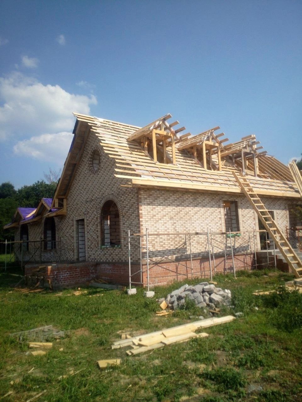 •  Устанавливаем стропильную систему, выполняем монтаж изоляционного слоя и кровельного материала